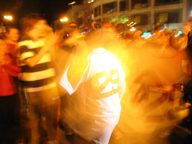 An ecstatic Sox fan dances a jig to the sound of the bagpipes.